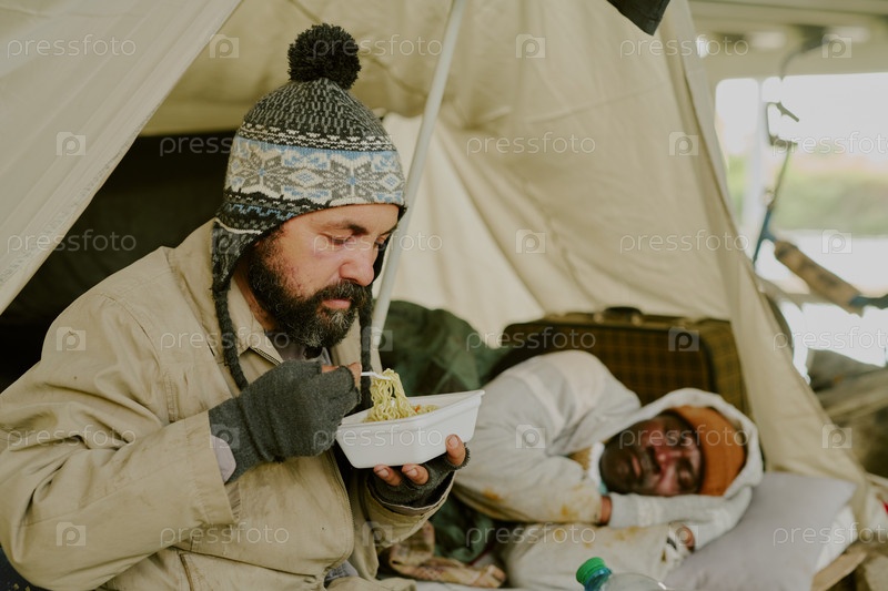 Бездомный человек ест лапшу рядом со спящим чернокожим мужчиной на открытом воздухе