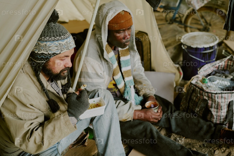 Бездомный мужчина и чернокожий человек едят пищу, сидя на улице
