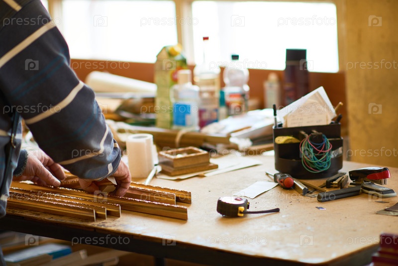 Человек собирает деревянную раму в условиях мастерской