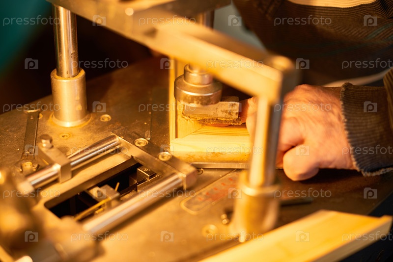 Старший человек собирает деревянный каркас с использованием промышленной машины