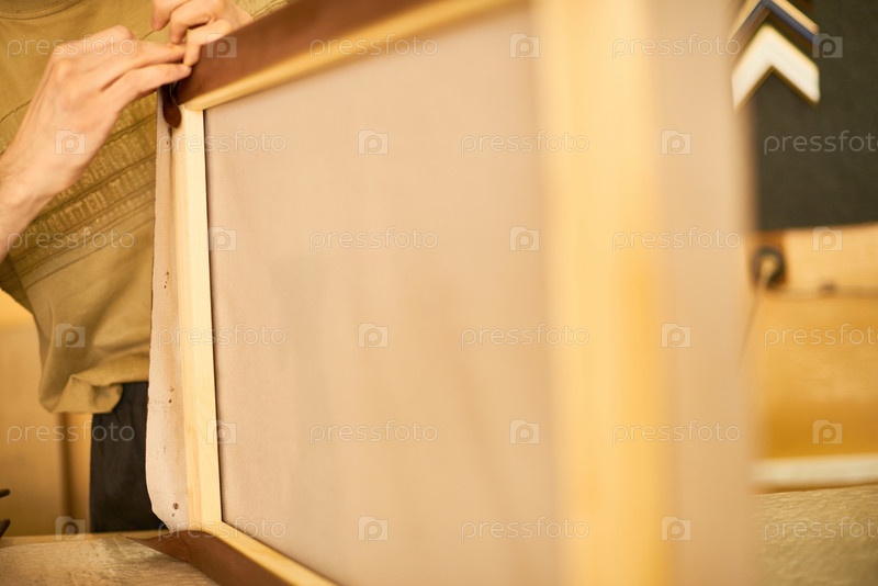 Человек растягивает полотно на деревянном каркасе в мастерской