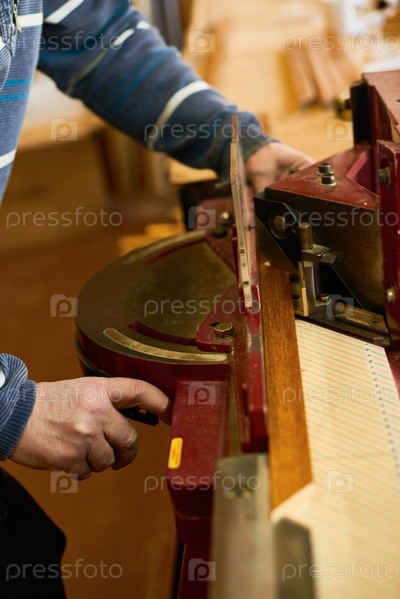 Человек, работающий с промышленной деревянной режущей машиной Man Indoors