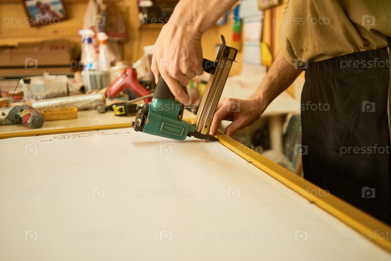 Сборка деревянной рамы с помощью электрического стиплера