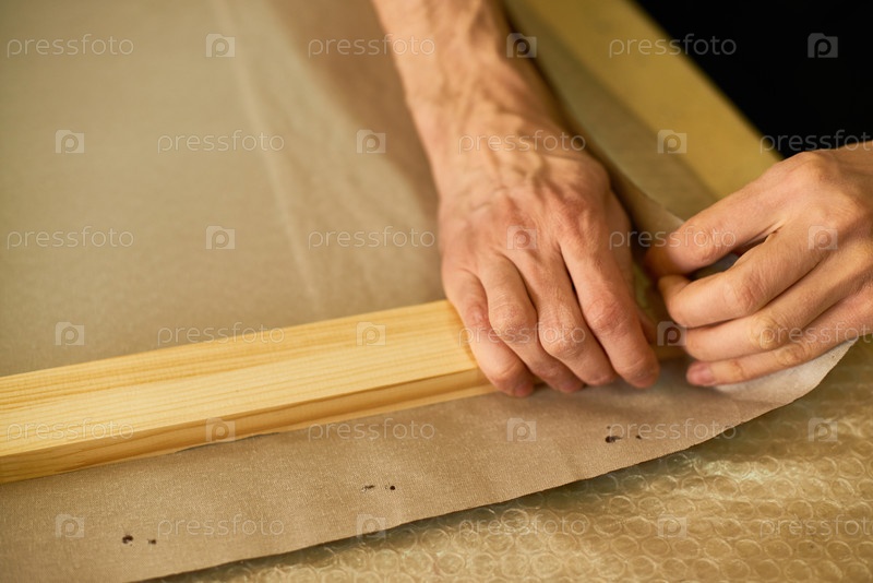 Опакование деревянной рамы человеком бумагой для защиты