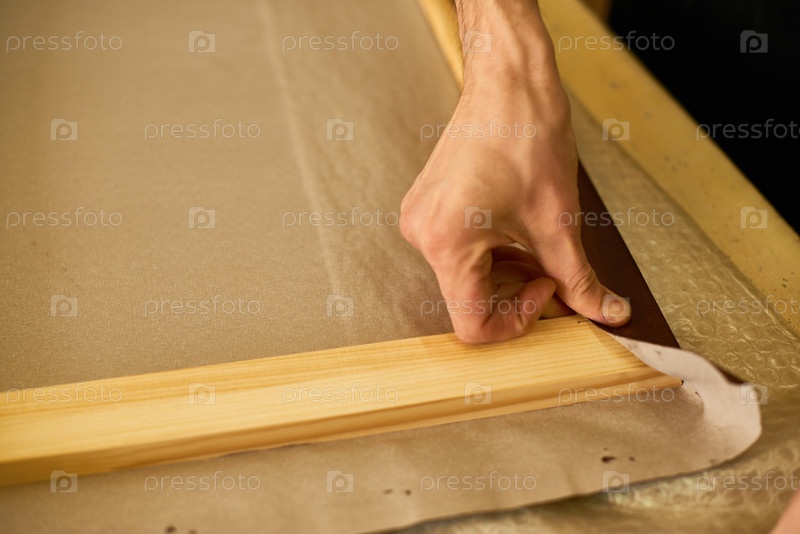 Человек закрепляет полотенце материала на деревянной раме вручную