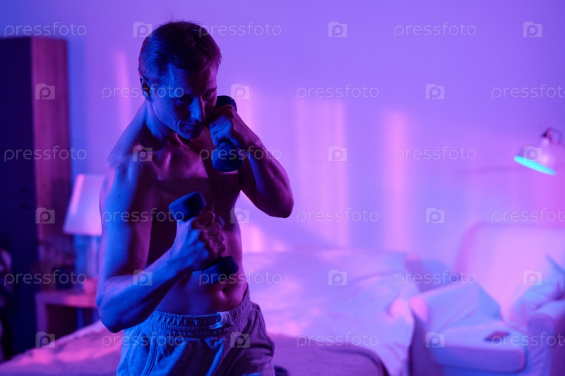 Мужчина, тренирующийся с гантеликами в спальне ночью