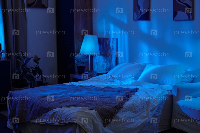 Пустая кровать в уютной спальне, освещенной голубым ночным светом