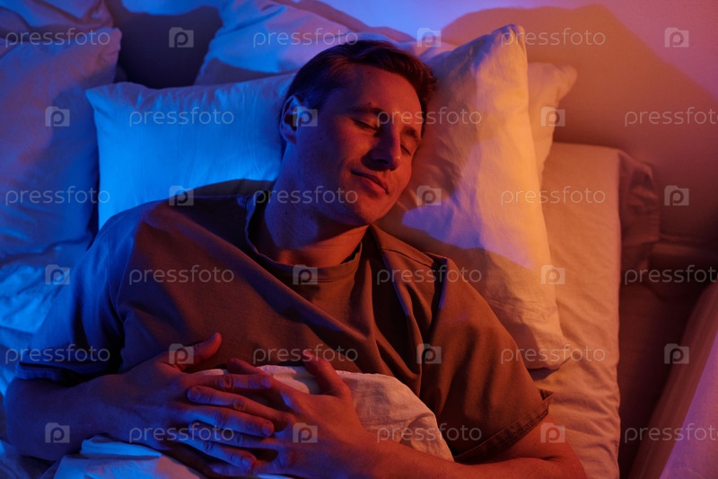 Человек, спокойно отдыхающий на кровати под мягким цветовым освещением