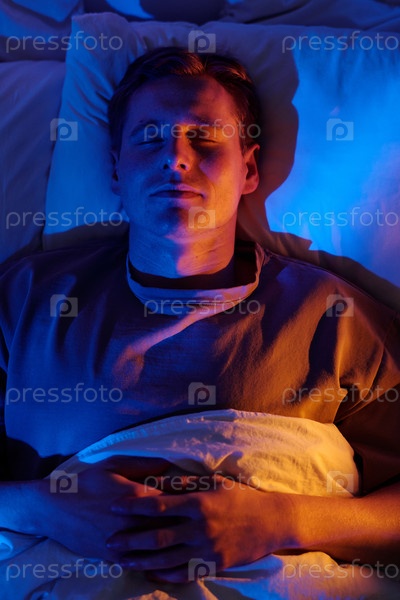 Человек, спокойно спящий под голубым освещением