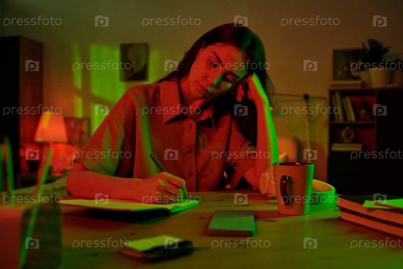 Молодая женщина сидит за рабочим столом и пишет в блокноте, выглядя усталым