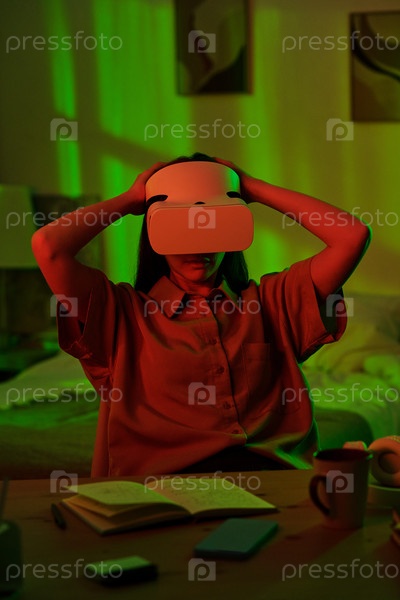 Женщина, испытывающая погружение виртуальной реальности в помещении