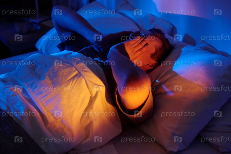 Лежащий в постели, борющийся с бессонницей ночью человек