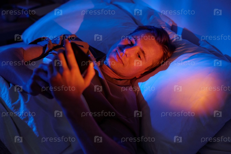 Молодой человек, лежащий в постели и использующий смартфон ночью