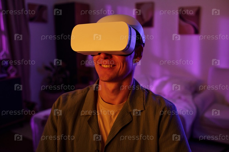 Человек, испытывающий виртуальную реальность с помощью гарнитуры в помещении