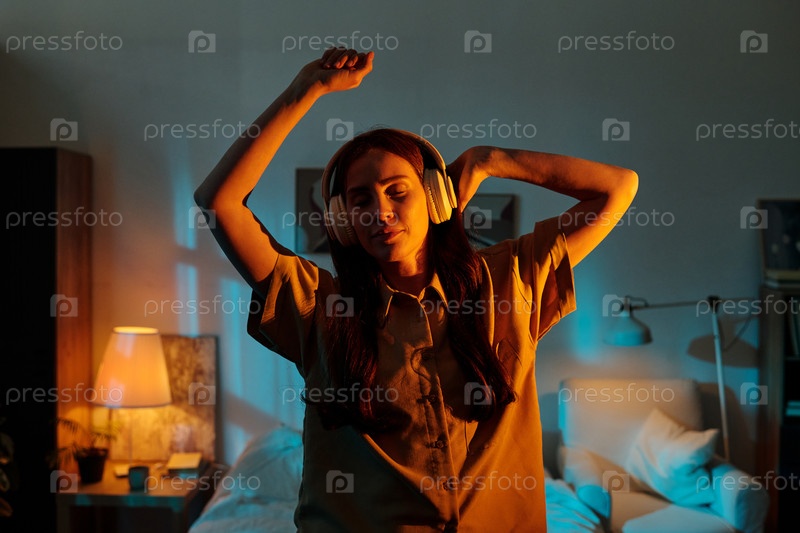 Женщина, наслаждающаяся музыкой и танцами с наушниками в помещении