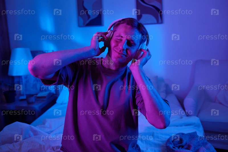 Мужчина, наслаждающийся музыкой с наушниками в спальне ночью