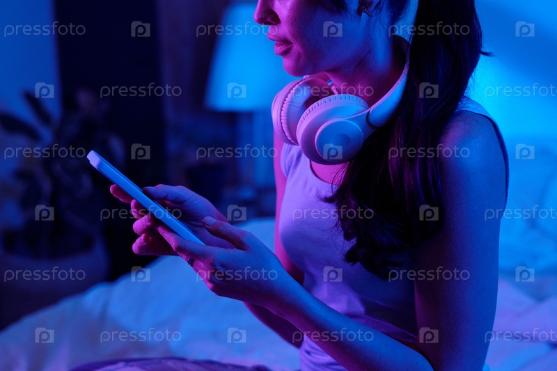 Женщина, использующая смартфон во время ношения наушников в помещении