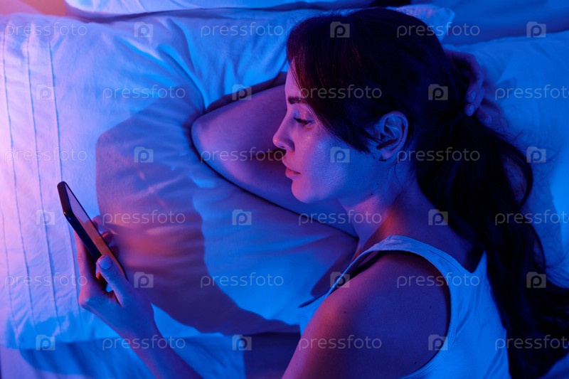Женщина, лежащая в постели и использующая смартфон ночью