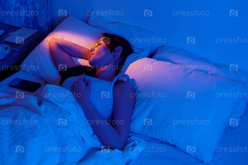 Отдыхающий в постели Освещенный женщиной с мягким синим освещением