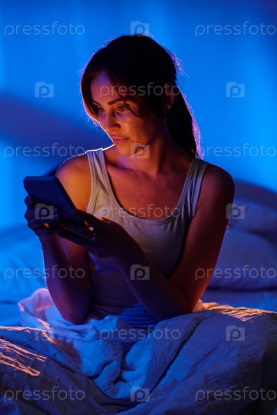 Женщина, просматривающая смартфон во время сидения в постели ночью