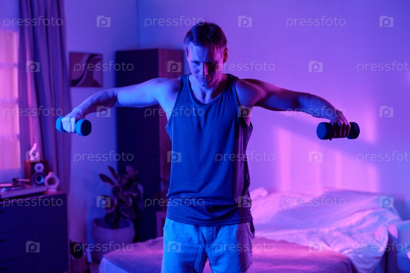 Упражнения с гантеликами в спальне дома мужчина