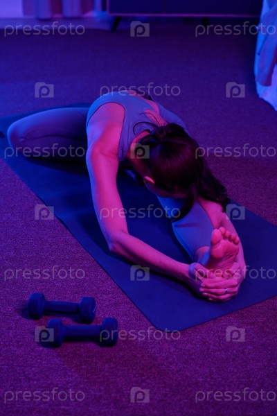Женщина, растягивающаяся на йога-матке во время домашней тренировки