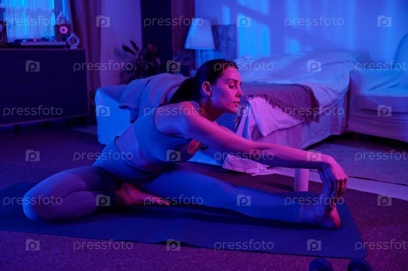 Женщина растягивает мышцы ног на йога-матке в вечернее время