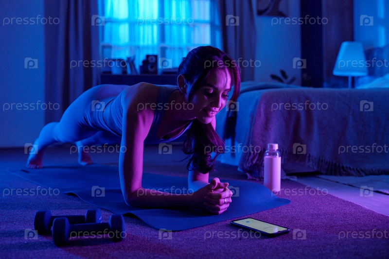 Женщина, выполняющая упражнения в помещении с помощью смартфона для руководства
