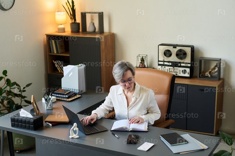 Старшая женщина-психолог, работающая за столом в современной офисной обстановке