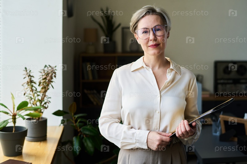 Портрет женщины-психолога, держащей в руках клипборд и улыбающейся