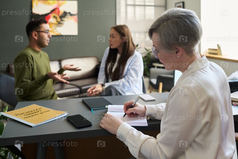 Женщина старший психолог консультирует молодую мультиэтническую пару
