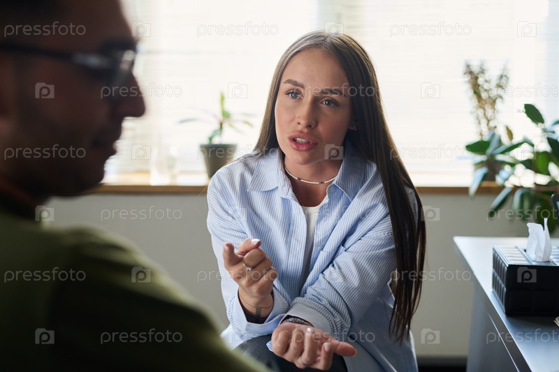 Молодая женщина-психолог консультирует мужчину в офисе