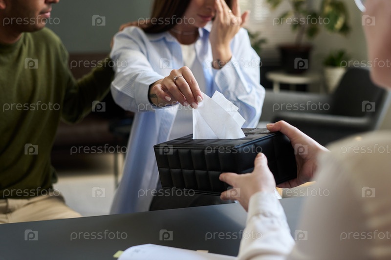 Молодая женщина плачет во время сеанса терапии с психологом, помогающим