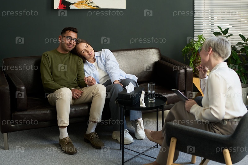 Молодая мультиэтническая пара, держащаяся за руки во время консультационного сеанса с психологом
