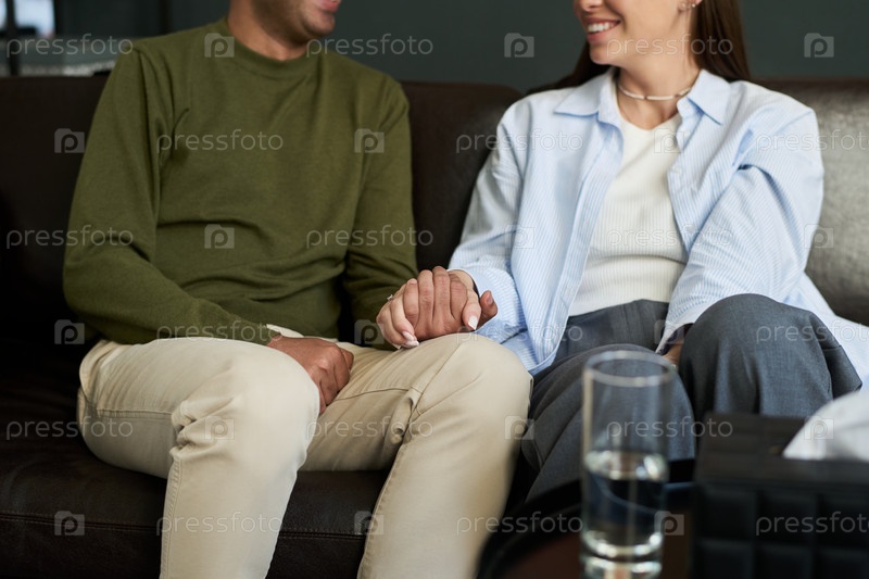Молодая мультиэтническая пара, держащаяся за руки во время консультации психолога