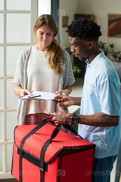 Женщина, рассматривающая форму доставки с чёрным мужчиной курьер Indoors Woman