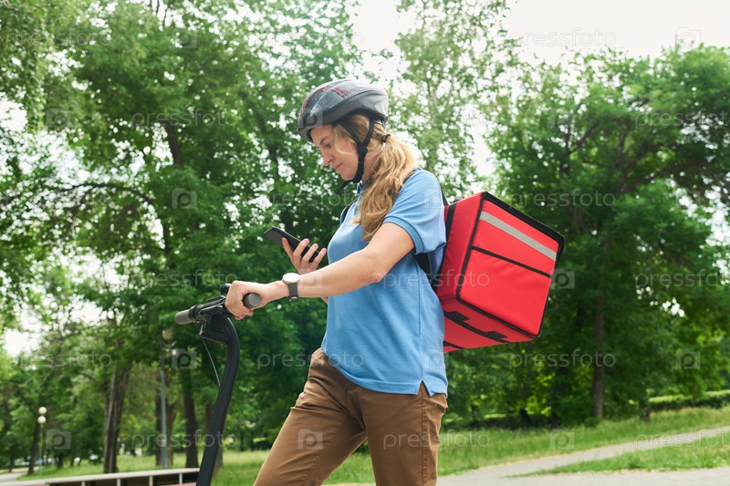 Женщина едет на электрическом скутере, используя смартфон на открытом воздухе