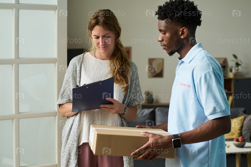 Женщина просматривает клипборд, в то время как чернокожий человек доставляет пакет
