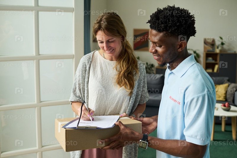 Женщина подписывает форму доставки, врученную чёрным мужчиной курьером