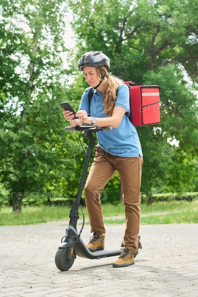 Женщина, стоящая на электрическом скутере, проверяет смартфон