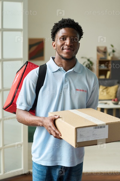 Портрет чернокожего человека, доставляющего посылку и несущего изолированную сумку