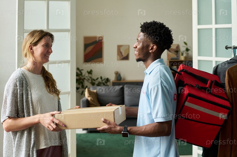 Женщина, получающая посылку от чёрного курьера в помещении