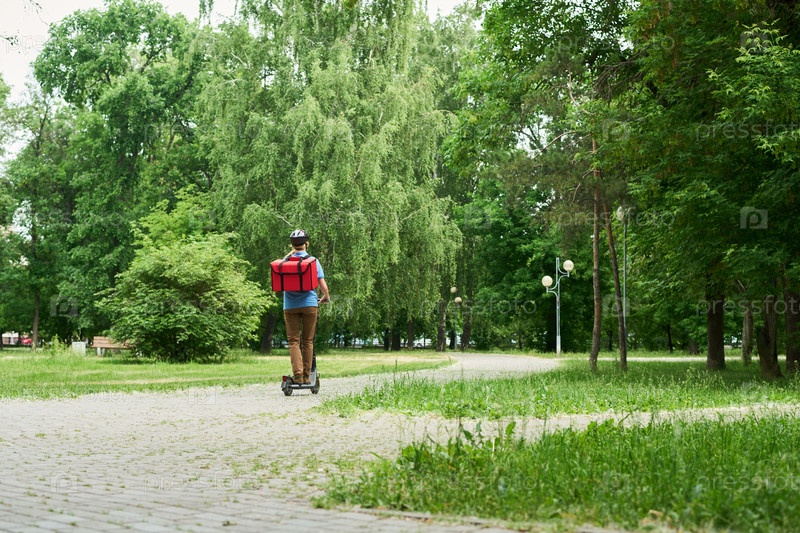 Человек, едущий на электрическом скутере и доставляющий пищу на открытом воздухе