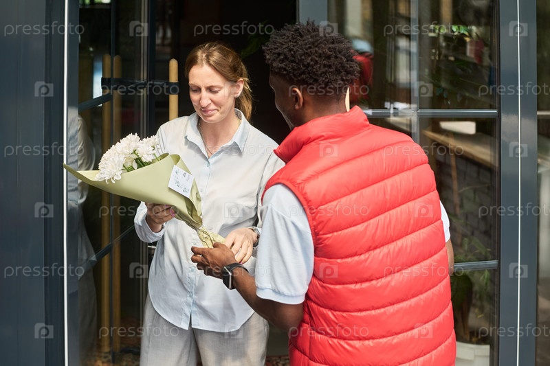 Женщина с улыбкой, получающая цветы от чернокожего мужчины на пороге