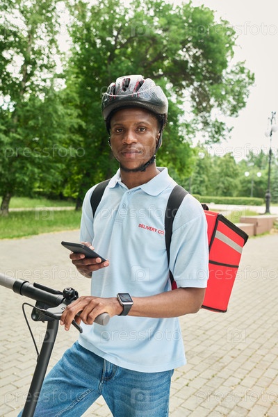 Чернокожий мужчина использует смартфон, стоя на электрическом скутере