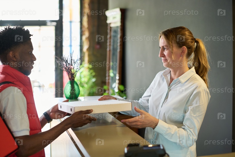 Передача коробки с пиццей чернокожей женщине