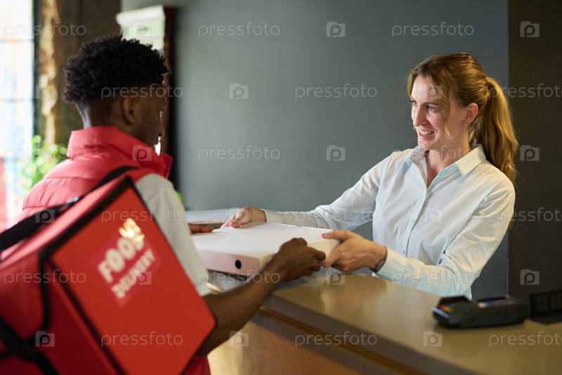 Женщина, получающая доставку пиццы от чернокожего мужчины
