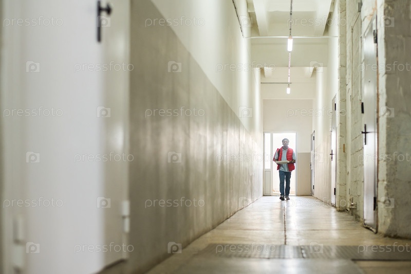 Человек, идущий по промышленному коридору, несущий документы
