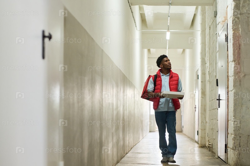 Чернокожий человек доставляет коробку с пиццей, гуляя по коридору квартиры