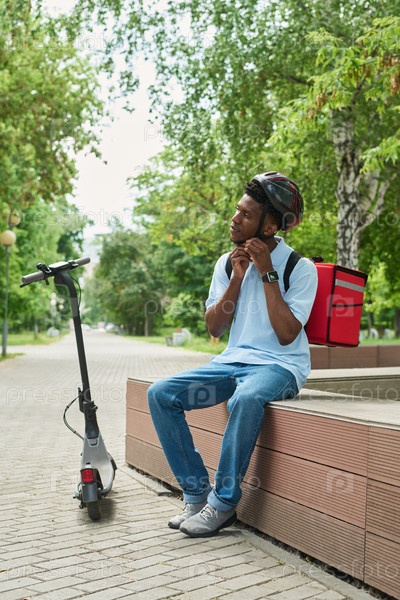 Черный мужчина, закрепляющий шлем, готовится к доставке на электрическом скутере